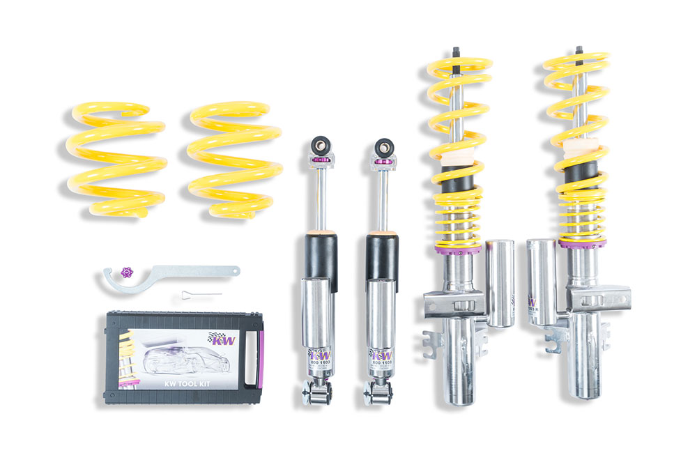 La característica especial del KW V3 es la amortiguación ajustable de rebote y compresión, que le permite ajustar el comportamiento de conducción exactamente a sus necesidades. Esto conduce a un manejo significativamente mejorado y una mayor dinámica de conducción. Esta versatilidad diferencia a la suspensión deportiva ajustable en altura de las suspensiones deportivas convencionales y le ofrece la oportunidad de llevar el placer de conducir a un nuevo nivel. Es perfecta para los conductores que valoran un aspecto deportivo y un comportamiento mejorado sin renunciar a la flexibilidad.
